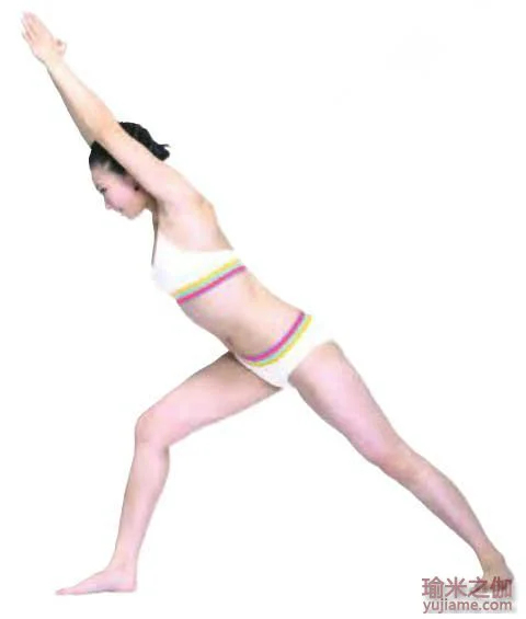 2、吸氣,雙臂高舉過頭頂,雙掌合十,雙臂在耳後夾緊並盡力伸展。呼氣,上半身轉向右側並向右側下壓,同時彎曲右膝,挺直脊背,左腿伸直。