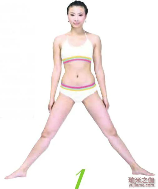 1、深吸氣,雙腳張開2倍肩寬,左右腳尖略向外展,腳掌平放地上,腳趾朝向左右兩側。雙手自然放於體側。