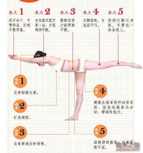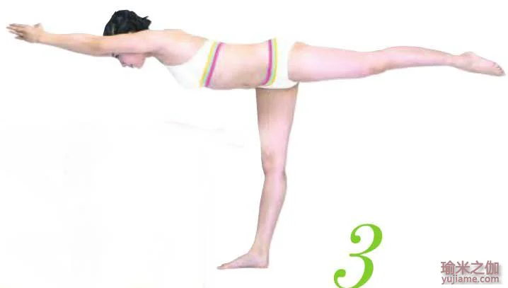 3、將左腿向上抬起,同時吸氣收腹,以腰部為中心,上半身向前傾。一邊伸直左腿,一邊壓低上半身,用右腿支撐身體的重量。此時,保持手臂、左腿和身體在一條直線上。保持這個姿勢5~20秒鐘後換另一側進行同樣的練習。