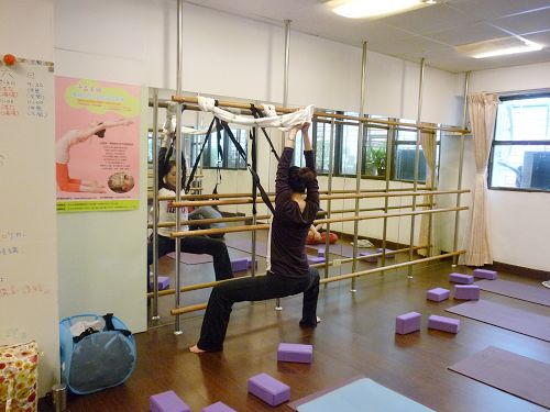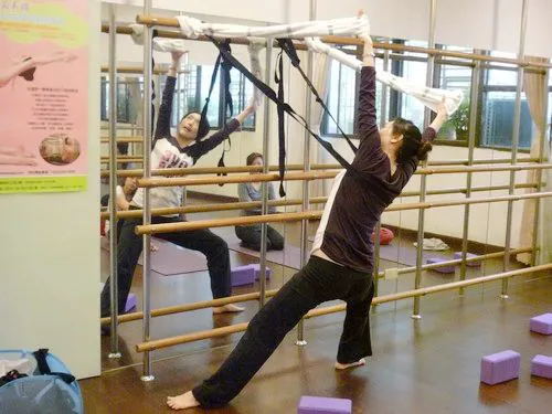 1、 取數條伸展帶,固定於把竿上,將黑色伸展帶套在肩胛骨給予支撐,雙手分別套進白色伸展帶預備。