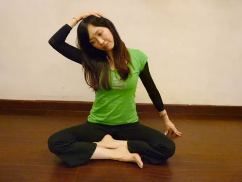 1、 右手越過頭頂放在左太陽穴上,頭慢慢往右側倒,右耳靠近肩膀,注意不要刻意聳肩讓耳朵更靠近肩膀,重點放在頸部左側肌肉的伸展,保持幾個順暢的唿吸。