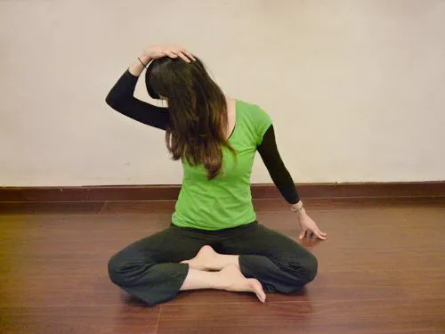 2、 再試著慢慢轉動頸椎,臉轉向右手臂,停留在感覺最緊繃的地方伸展一下,結束後換邊練習。