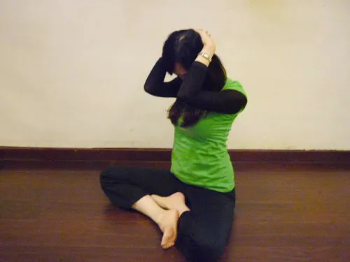 3、 雙手抱頭,手肘向內夾,慢慢低頭,讓後方頸椎一節一節彎屈至緊繃位置後,停留伸展,結束後還塬。