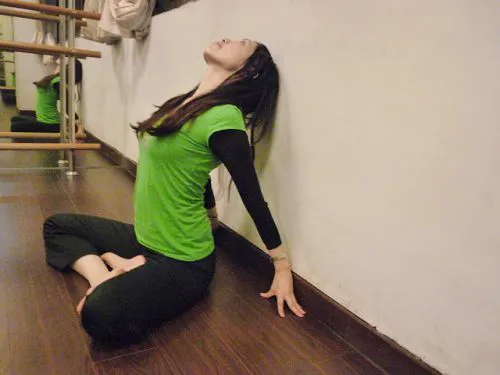 4、 雙手撐在後方地板,打開胸腔後,頭慢慢往後仰,下巴抬起,視線往上看天花板,停留幾個吸吐做伸展,或重複數個回合。
