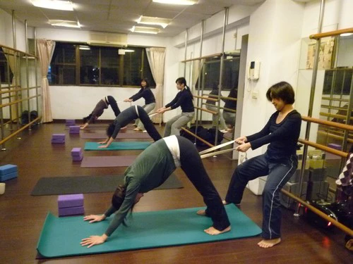 下犬式的腿如果沒有出力,身體重心將一面倒向肩頸與手臂,我們可藉由雙人練習與伸展帶的輔助,讓同學們感受一下腿出力的效果,這個動作被我們戲稱為遛狗式。