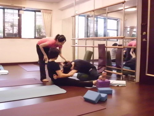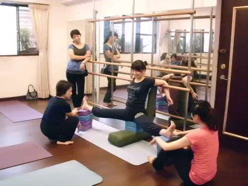 1、 二人一組雙人練習,靠近把竿,先取一瑜伽枕朝向牆面擺放,在上面放上瑜伽磚;另取一個瑜伽枕直立放在上面,取數個瑜伽磚放在左右前面地板上,坐在瑜伽磚上,雙腳打開至適當(舒適)的距離,瑜伽磚的數量可適個人情況增減。
