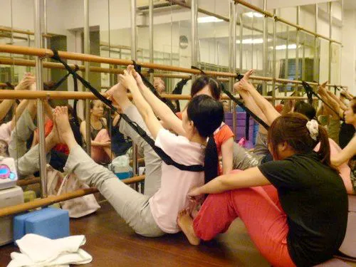 1、 將瑜伽伸展帶固定在把竿上,前方同學將伸展帶套在肩胛骨部位,雙腳踩在把竿上。