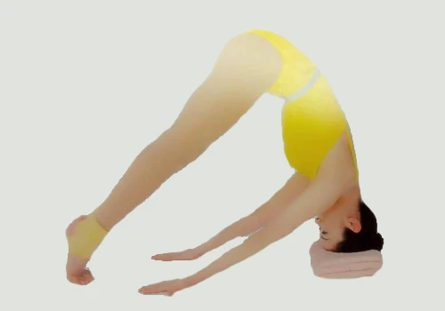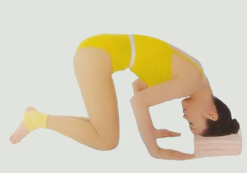 2、吸氣,前彎讓頭在前方地板著地,雙手撐在地上吐氣。