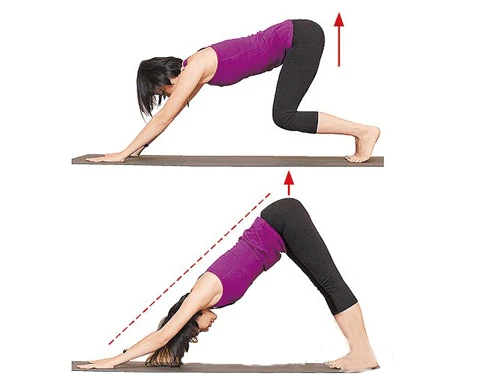 在上個步驟的基礎上,將雙腿膝蓋慢慢抬起,上半身下壓,使手臂與背部呈直線,腳跟盡量踩地、膝蓋伸直,停10~15個呼吸為1組,次數不拘。 若腳跟無法踩到地面,可將膝蓋稍彎,腳跟下墊1塊厚毛巾。