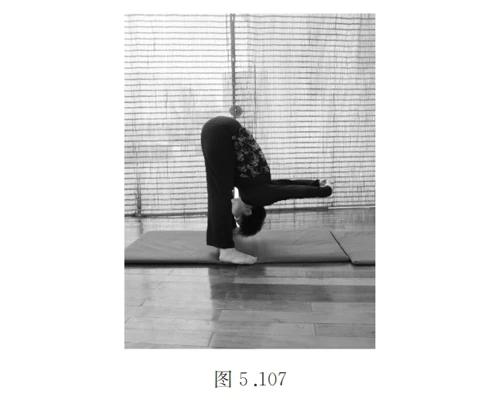 2.緩緩呼氣,翻轉手心向外,上體平直下壓,放鬆頭部、肩腳骨、頸項,自然呼吸保持15秒鐘。(圖5.107)