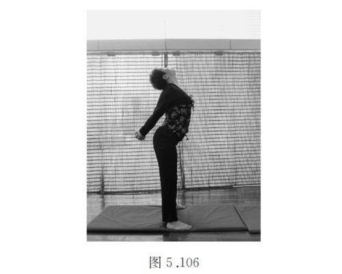 1.緩緩吸氣,雙手十指交叉於體後,頸後仰,保持肘伸直,手向上向後抬,靠近頭部,自然呼吸保持6秒鐘。(圖5.106)
