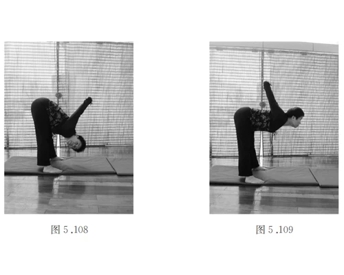 4.緩緩吸氣,上體平直抬起。緩緩呼氣,頭部、身體回正,放鬆手臂,還原雙腳成站姿。(圖5.109)