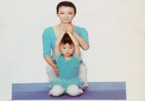 3、將孩子的雙手置於頭頂後合掌。