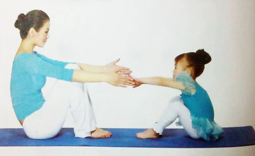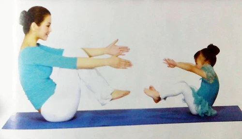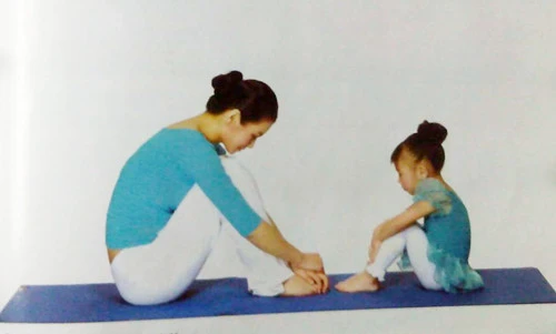 1、大人和孩子面對面坐,彎曲雙腿,雙腳併攏緊貼地面。