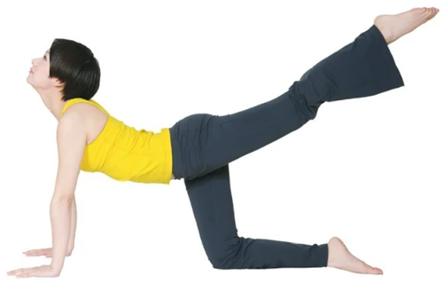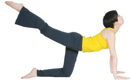 3.吸氣,腰部下沉,抬頭挺胸,眼睛望向前上方,右腿盡量向後上方伸直,保持姿勢20秒。