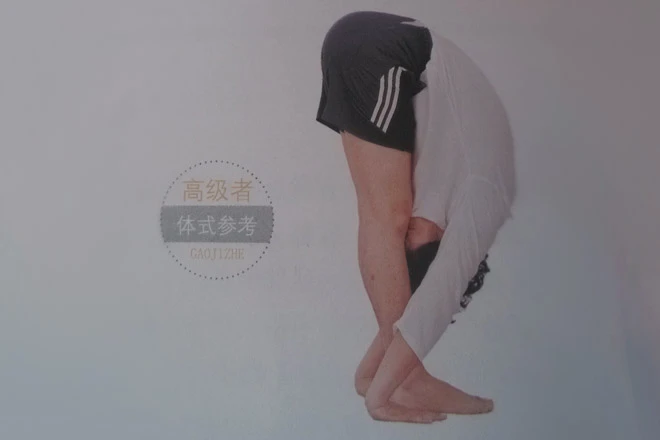 2、呼氣,身體前屈,把手掌放在地面上。注意不要屈膝。再將頭抬起,伸展脊柱,臀部稍向前從而使腿部與地面垂直。保持這個體式,進行兩個深長的呼吸。