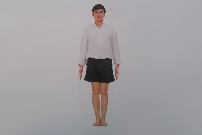 2、雙腿向兩側封開2~3個肩寬。腳跟稍向外,腳趾稍向內,雙臂側平舉與肩齊,雙臂與地面保持平行,雙腿雙臂伸直。