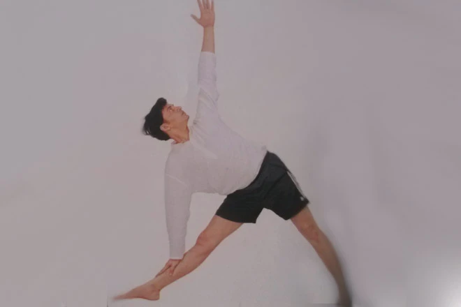 4、眼睛向前看,吸氣,右臂抬起,起身,雙臂向兩側伸展。右腳回收。回到第2步。再將左腳向左側打開90度,在左側重複同樣體式。結束後,呼氣,雙腳收回。回到山式