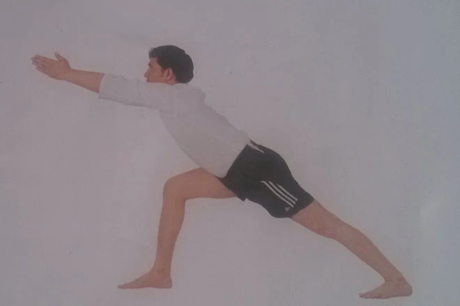 3、身體完全轉向右側,雙臂伸直,肘關節繃緊,眼睛向前看。右腿彎曲,保持正常地呼吸。