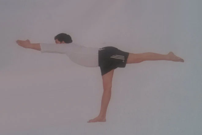 5、呼氣,身體稍向前擺,同時抬起左腿離地,右腿伸直,膝蓋繃緊,右腳充分固定在地面上。向內轉左腿使左腿前部與地板保持平行。保持平衡的同時,除了右腿,整個身體要與地板平行。右腿應該完全伸展並繃直,與地面保持垂直。盡量拉伸右大腿後部,伸展雙臂和左腿。保持這個體式20~30秒,深長地呼吸。