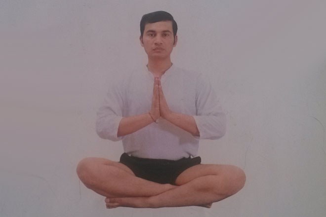 2、彎曲左膝,再彎右膝,雙腿彎曲自然盤坐,脊柱挺直,雙手合十於胸前。