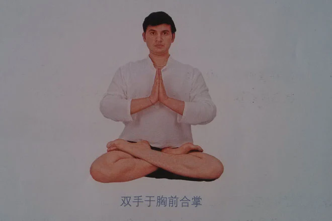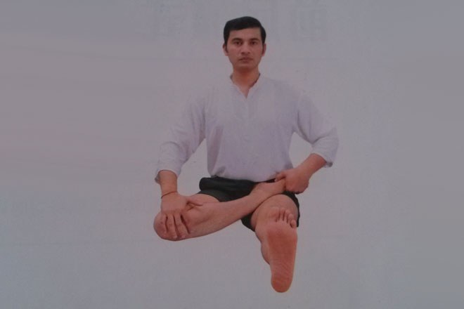 3、彎曲左腿,用手抓住左腳放在右大腿上,盡量靠近大腿根部,腳跟靠近臍部,腳底翻轉向上。從身體底部到頸部,脊柱始終保持挺直。手臂向外伸展,右手放在右膝上,左手放在左膝上,雙手食指和拇指彎曲相合。或者將雙手於胸前合掌。