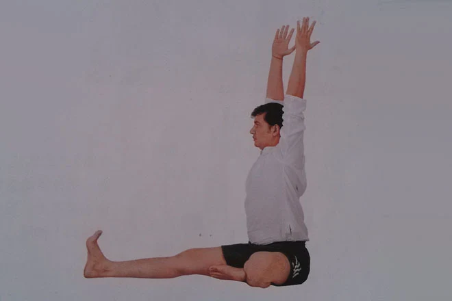 5、吸氣,抬起頭部和軀幹,雙臂伸直,眼睛向前看幾秒鐘,脊柱伸張,試著使脊柱下凹,回到第3步。再鬆開抓住右腳的雙手,軀幹立直,雙臂向上伸展,回到第2步。最後將左腿伸直,雙臂放下。彎曲右腿重複上述體式。注意兩側保持相同的時間。
