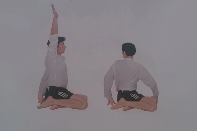 4、呼氣,右手放在左膝上,頸部、腰部向後扭轉,眼睛向後看。脊柱挺直,胸部打開,上體軀幹向上提起,身體不要向後傾斜,保持正常呼吸。