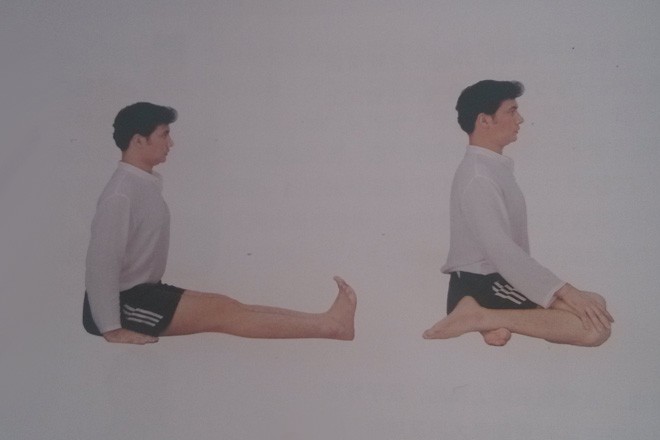 2、雙腿彎曲,放於臀部右側,左腿在下右腿在上,右腳腳踝放於左腳腳心之上,左臀坐在地面上。