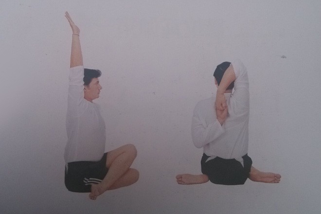 4、右臂向下彎曲,左臂向後向上抬起,雙手背後相握。右肘關節於頭部後側最大限度地向上伸展,保持脊柱挺直,胸部、右側腋窩打開。保持30秒鐘後,反方向重複同樣的體式。