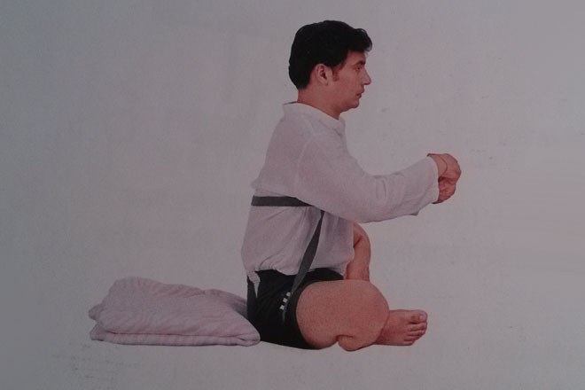 1、坐在地面上,薄毯子疊好放在背後。雙腳腳掌併攏,瑜伽帶從頭部逃入。