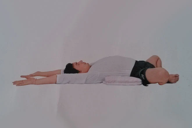 3、雙臂伸直放在頭部上方地面上,手掌心向上。胸部打開,保持深呼吸。閉上眼睛,讓身體、大腦完全放鬆,保持這個體式約5分鐘。
