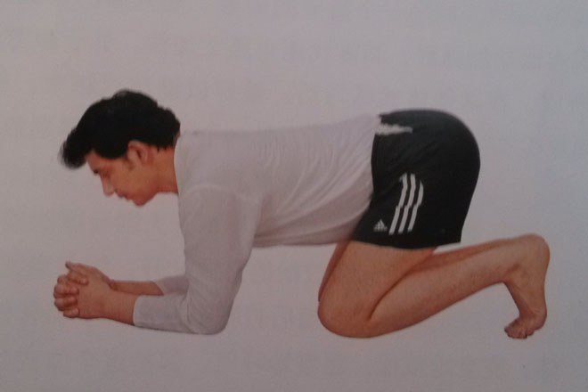 1、雙膝跪在地面上,前臂兩肘分開約與肩同寬,雙手十指相扣呈杯形,雙腿彎曲,腳趾著地。