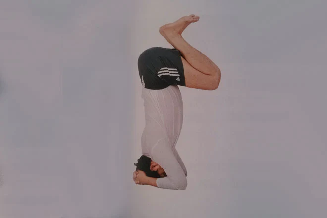 2、頭頂著地,相扣的雙手抱住後腦,使頭後部抵在雙手相成的杯形中,注意不要把前額或頭後部放在地面上,只有頭頂觸地。雙手要始終相扣抱住後腦。雙腿伸直,雙腳向頭的方向移動。