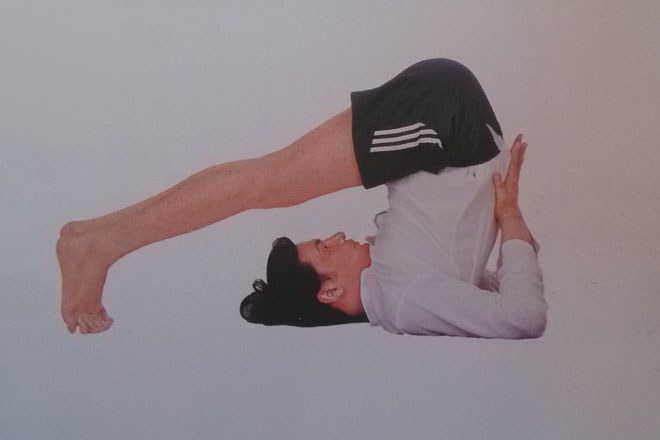 2、利用個手掌的壓力抬起軀幹,雙腿向上抬起後甚至,胸骨抵住下巴從而形成一個穩定的下巴鎖定的體式,只有頭的後部、頸部以及上臂的後部放在地面上。身體的騎馬部位應該呈一直線,與地面垂直。繃緊大腿後部肌肉,垂直向上伸展,以避免雙腿搖擺。兩肘之間的距離不超過肩寬,試著把雙肩從頸部向後伸展,並把雙肘盡量靠近,加入肘部撐開,軀幹就無法正確地拉伸,形體就不完美,保持體式不少於5分鐘,逐步增加保持提示的時間到15分鐘。