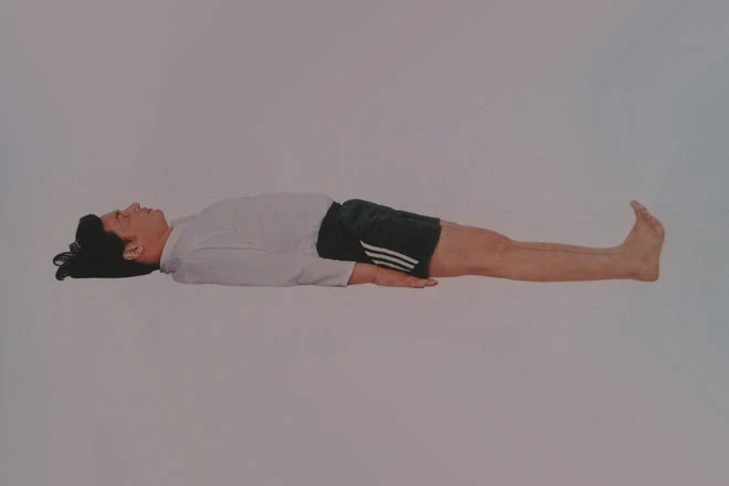1、平躺在地面上,雙臂放於身體兩側,手掌心向下,腳趾尖朝上。