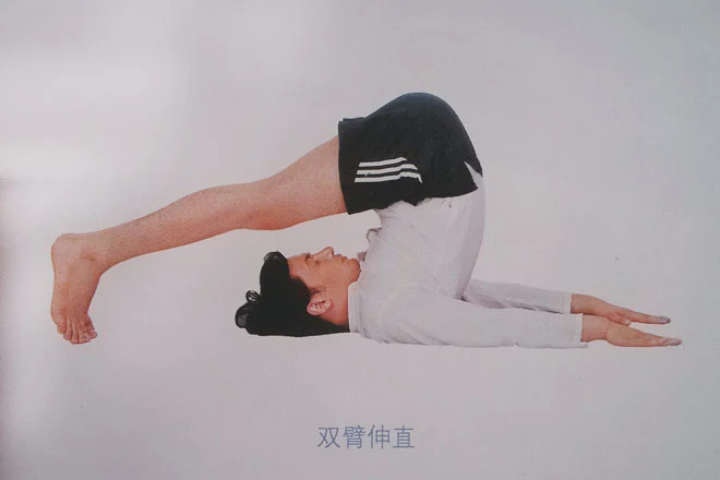 3、呼氣,雙腿放於頭部後側,腳趾尖點地,雙腿伸直,雙腳併攏,膝蓋繃緊,軀幹抬起,保持正常地呼吸。雙臂分開與肩同寬,伸直平行放於地面上。或者將雙臂彎曲,大臂及肘關節著地,小臂立起,雙手扶住腰背。保持這個體式3~5分鐘。