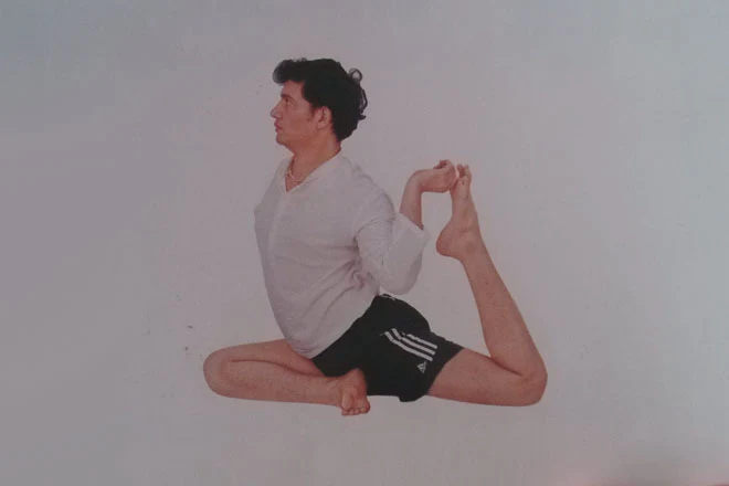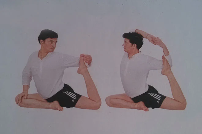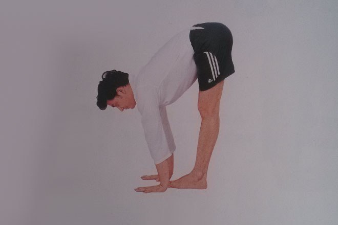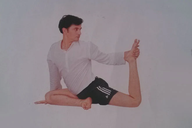 6、再次呼氣,右臂向後,右手也抓住左腳,放低頭部,使頭放在左腳上。保持這個體式。由於胸部腹部充分擴張,呼吸會急促,嘗試自然呼吸。