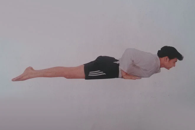1、腹部貼地,臉朝下,趴在地面上。兩腳分開與肩同寬。