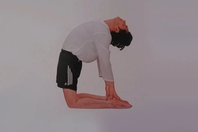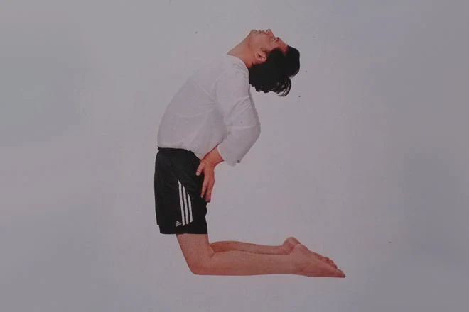 2、手掌放於臀部,脊柱後彎,雙肩向後然轉,胸部打開,頸部後仰,保持正常地呼吸。