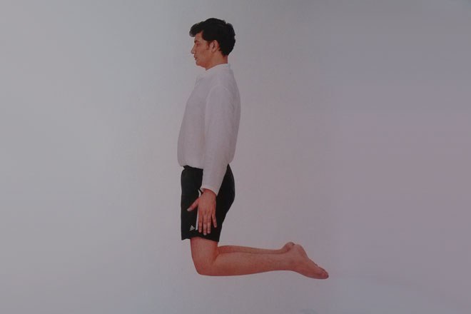 1、跪在地面上,上半身立直,雙膝雙腳分開,腳背攤開,腳趾朝後,雙臂放於身體兩側,目視前方。