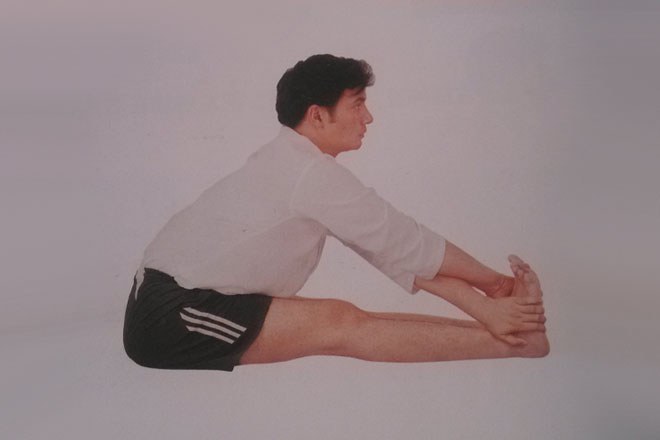 1、以手杖式坐姿,坐在地面上,雙腿向前伸直。