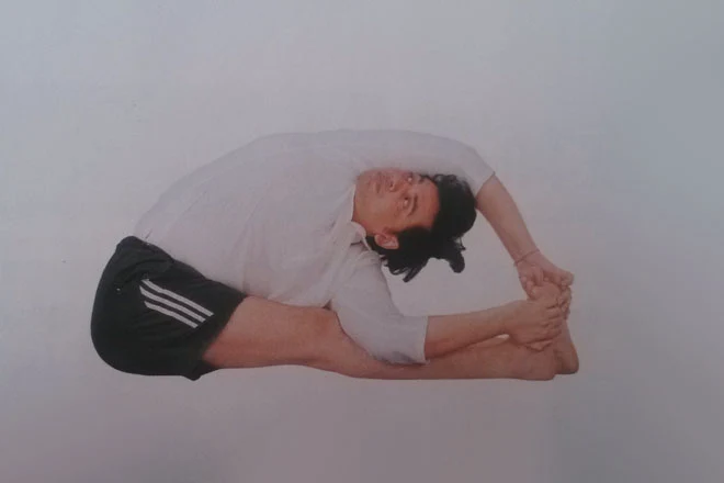 3、呼氣,背部前屈,雙臂交叉,右臂在上,左臂在下,分別握住另一隻腳外側,即右手握住左腳外側,左手握住右腳外側。保持兩次呼吸。