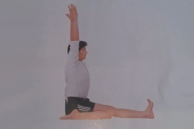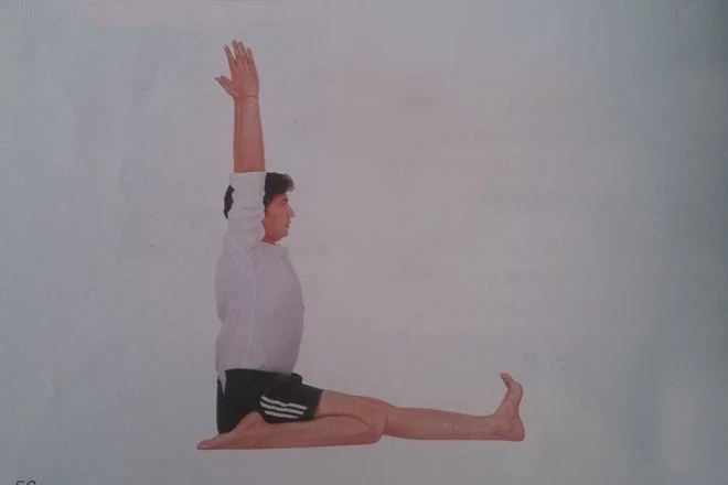 3、在第2步的體式上保持平衡,把身體的重量放在彎曲的膝蓋上。吸氣,雙臂伸直向上伸展。