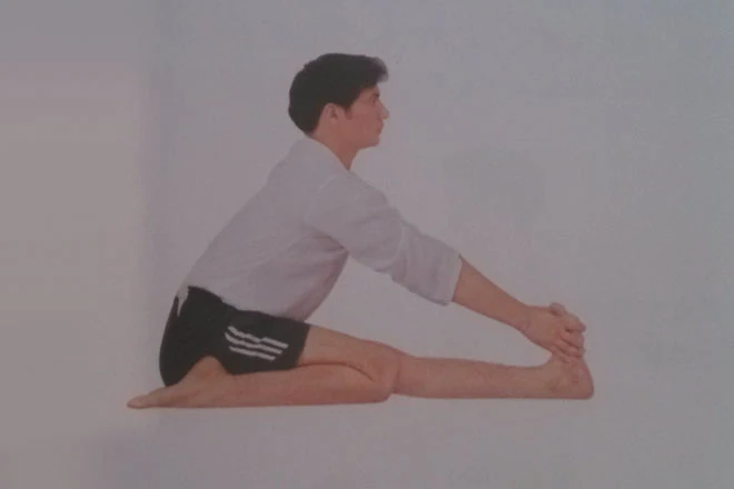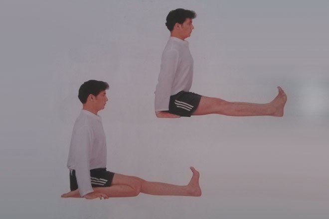 1、以手杖式坐姿,坐在地面上,雙腿向前伸直。