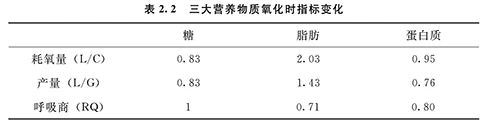 三大營養物質糖、脂肪、蛋白質在體內氧化時產生的二氧化碳與消耗的氧的容積之比,稱為呼吸商。由於三大營養物質的碳、氫、氧含量不同,所以在體內氧化時需要的氧容積和產生的二氧化碳的容積不同,因此呼吸商也不一樣。(表2. 2)