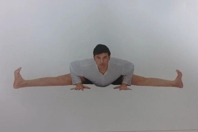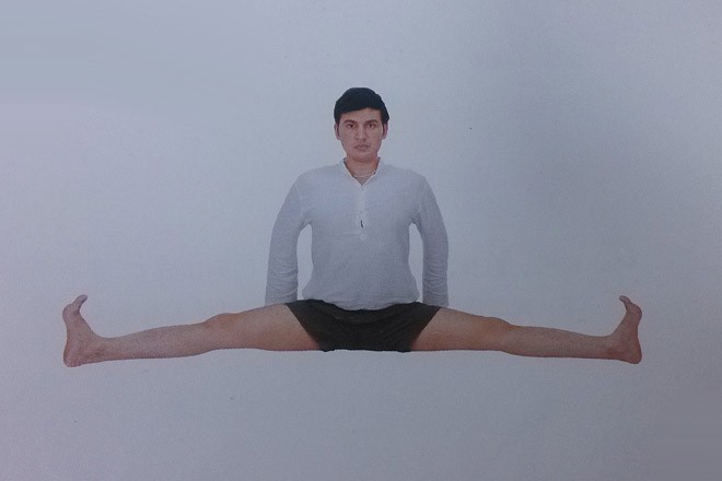 1、坐在地面上,調整好臀部,雙腿向兩側盡最大限度地分開,雙腿充分伸直,腳趾尖朝上,膝關節繃緊,雙手放於背後,十指指腹著地,保持脊柱充分伸展挺直。