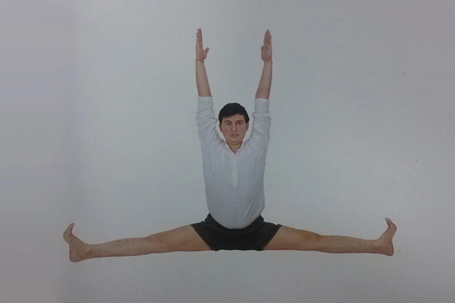5、吸氣,起身,雙臂向上伸展,回到體式1。在呼氣,雙臂放下,雙腿慢慢合攏收回。初學者可按下圖來練習。
