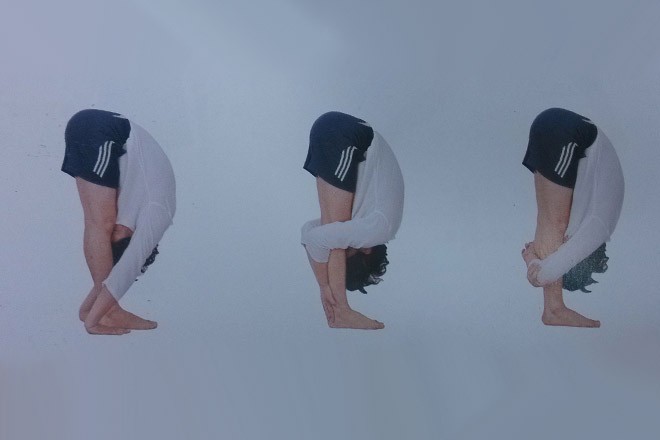 3、可能的話將雙手向後放於雙腳稍後的地面上;或雙手抱住小腿,前額嘗試放在膝蓋上。一定要保持雙腿伸直,膝關節繃緊。