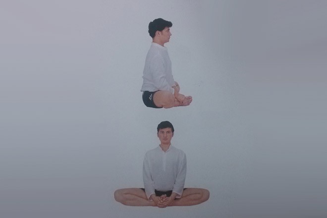 2、雙腿彎曲,腳跟、腳掌併攏相合,雙膝向兩側打開,平放於地面上。